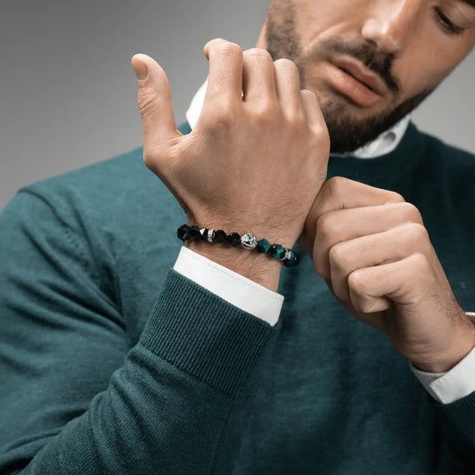 Men's GREEN TIGER EYE, ONYX Bracelet with Silver LION Head