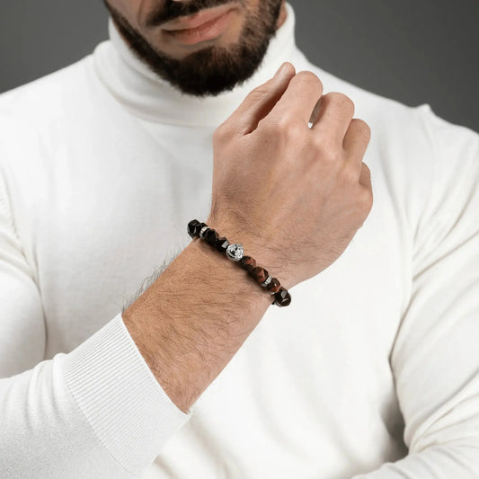 Men's RED TIGER EYE, ONYX Bracelet with Silver LION Head